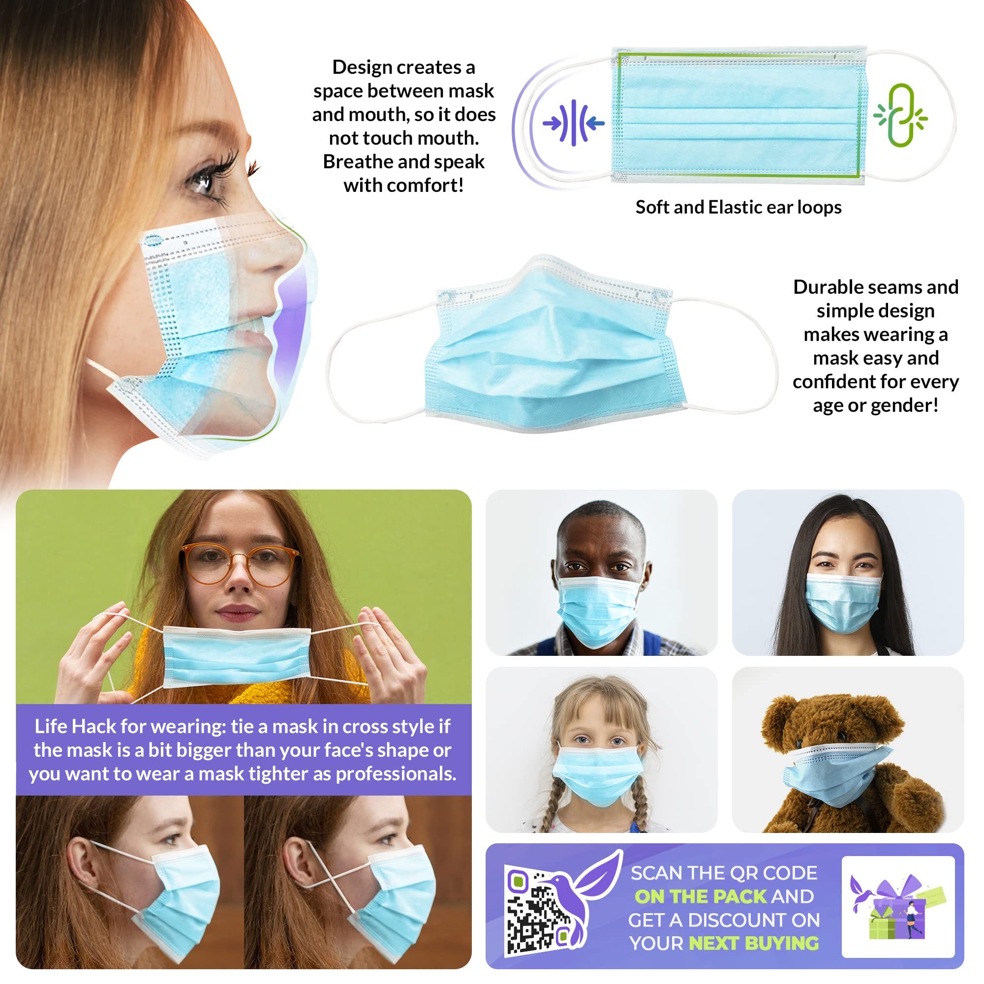 1.One size blue face masks, 3-ply.