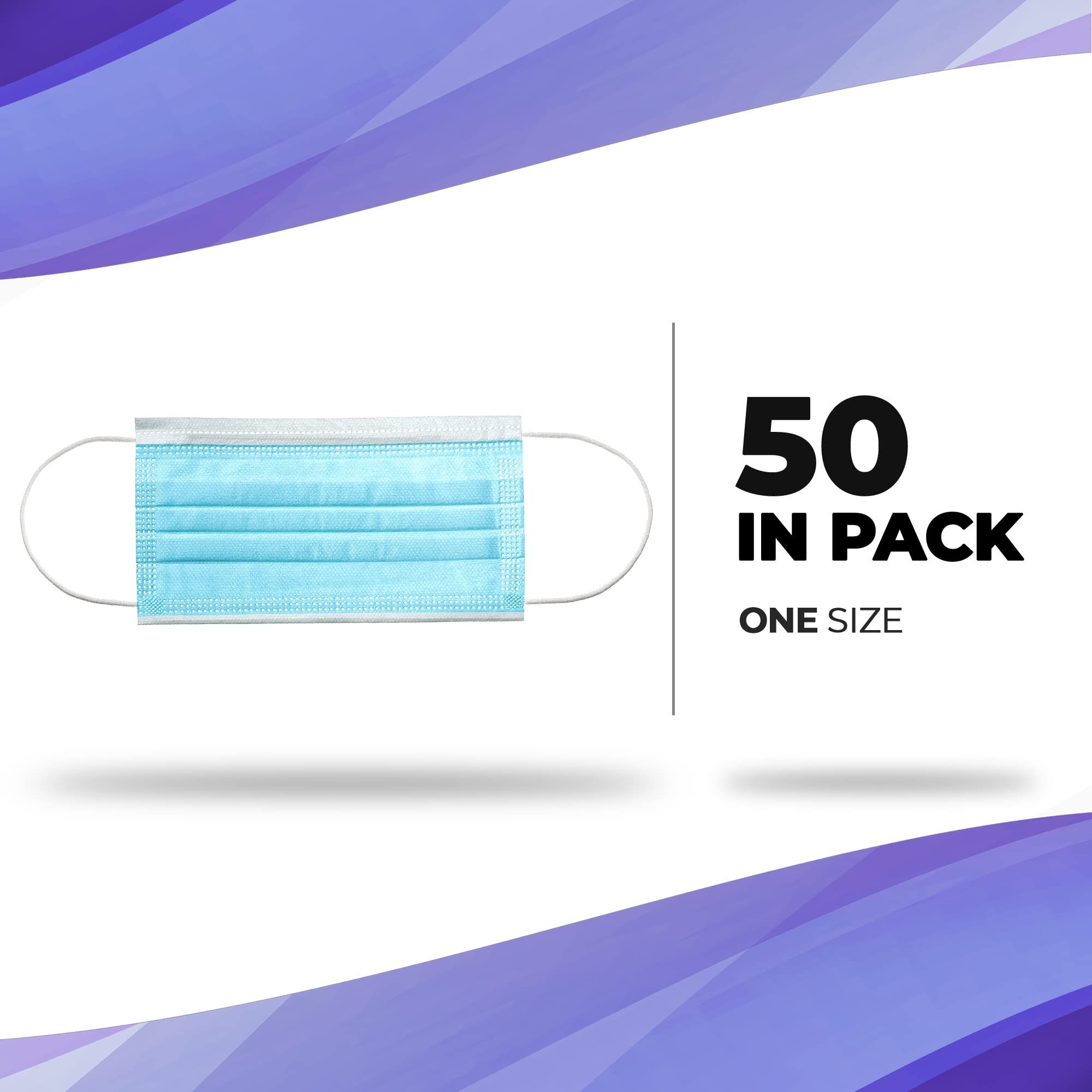 Disposable Face Masks. Pack of 50 Blue Adult Masks 3-ply. Disposable Face Guards, Face Masks Disposable Protectors with Adjustable Earloop for Outdoor