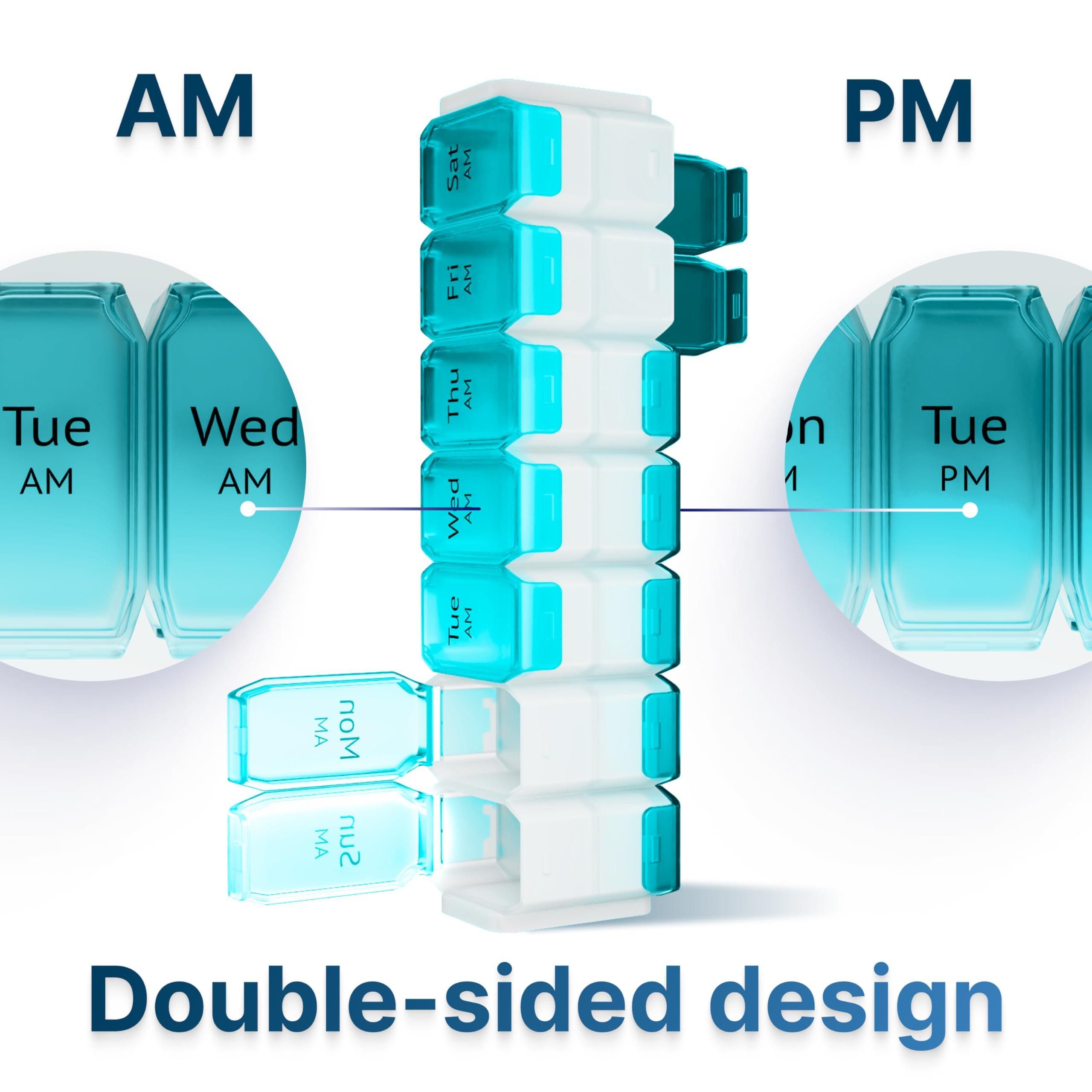 5.gradient blue design this twice a day medicine container features a stylish blue gradient and transparent plastic, making it easy to check at a glance if youve taken your pills for the day. each compartment is clearly marked for effortless organization throughout the week, with large, legible labels for added convenience