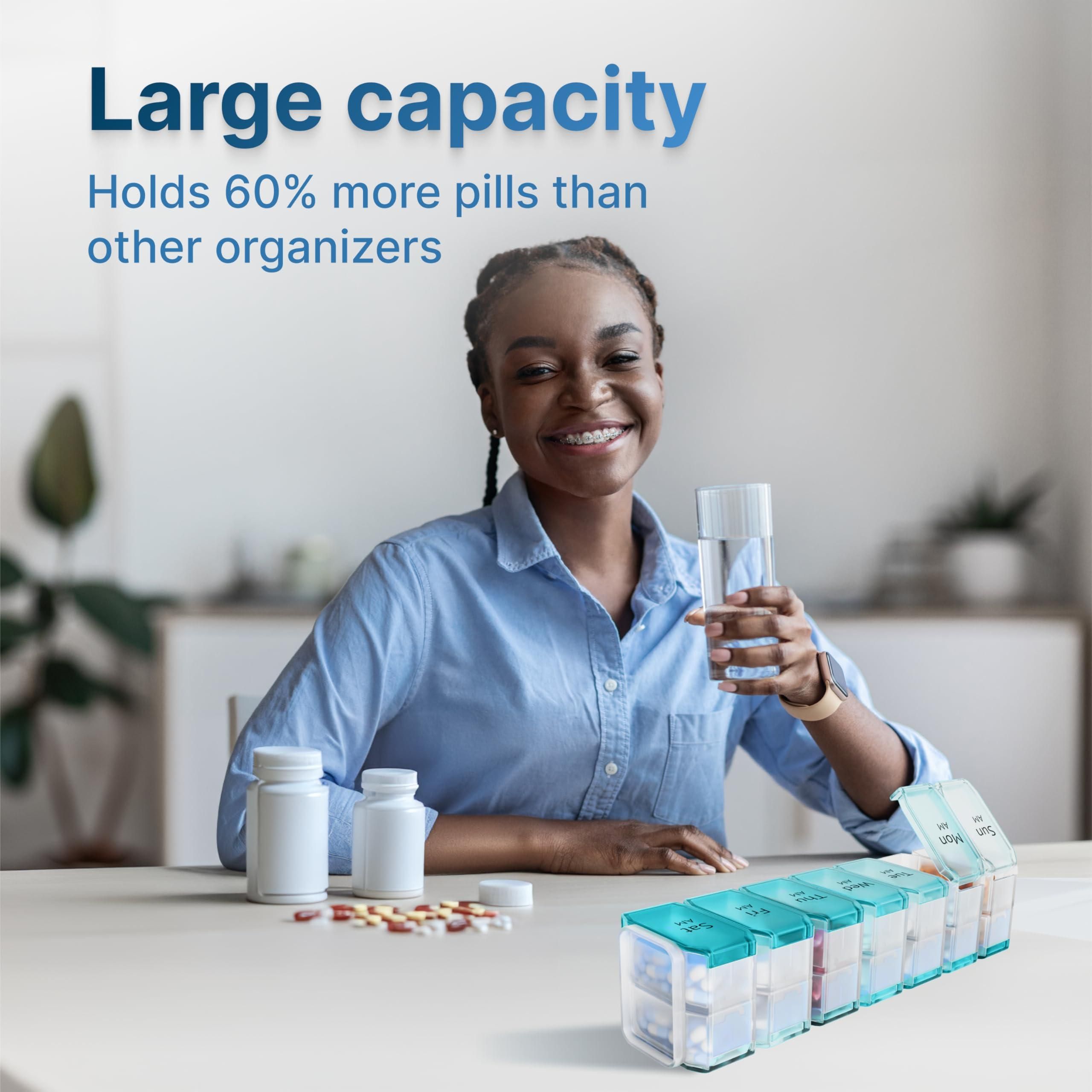 1.increased capacity: extra large pill organizer accommodates 50% more tablets than other pill boxes and organizer 2 times a day. its spacious compartments are ideal for larger supplements like fish oil capsules or gummy vitamins