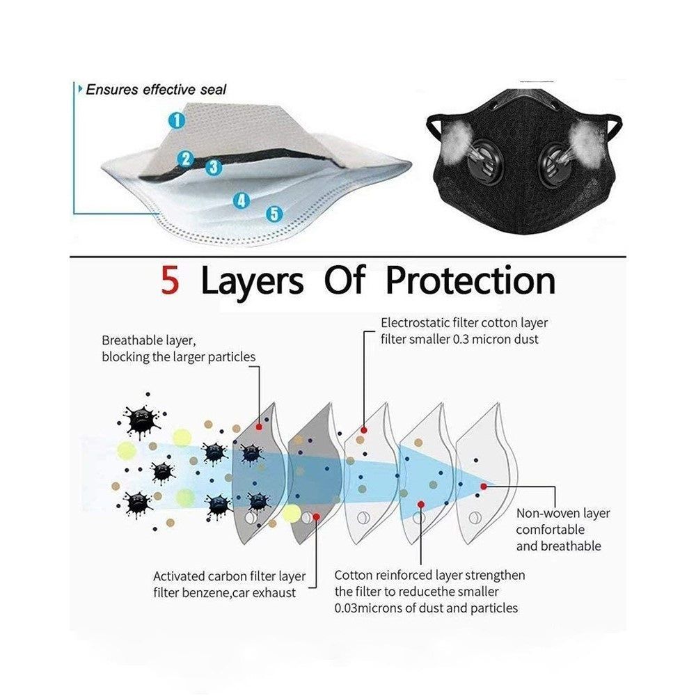 This Vivzone Activated Carbon Sport Face Mask helps you breathe clean fresh air in any environment by filtering up to 95% of particles as small as 0.3 microns, including bacteria, viruses, germs, exhaust, dust, chemicals, pollen, smoke, and fumes.
