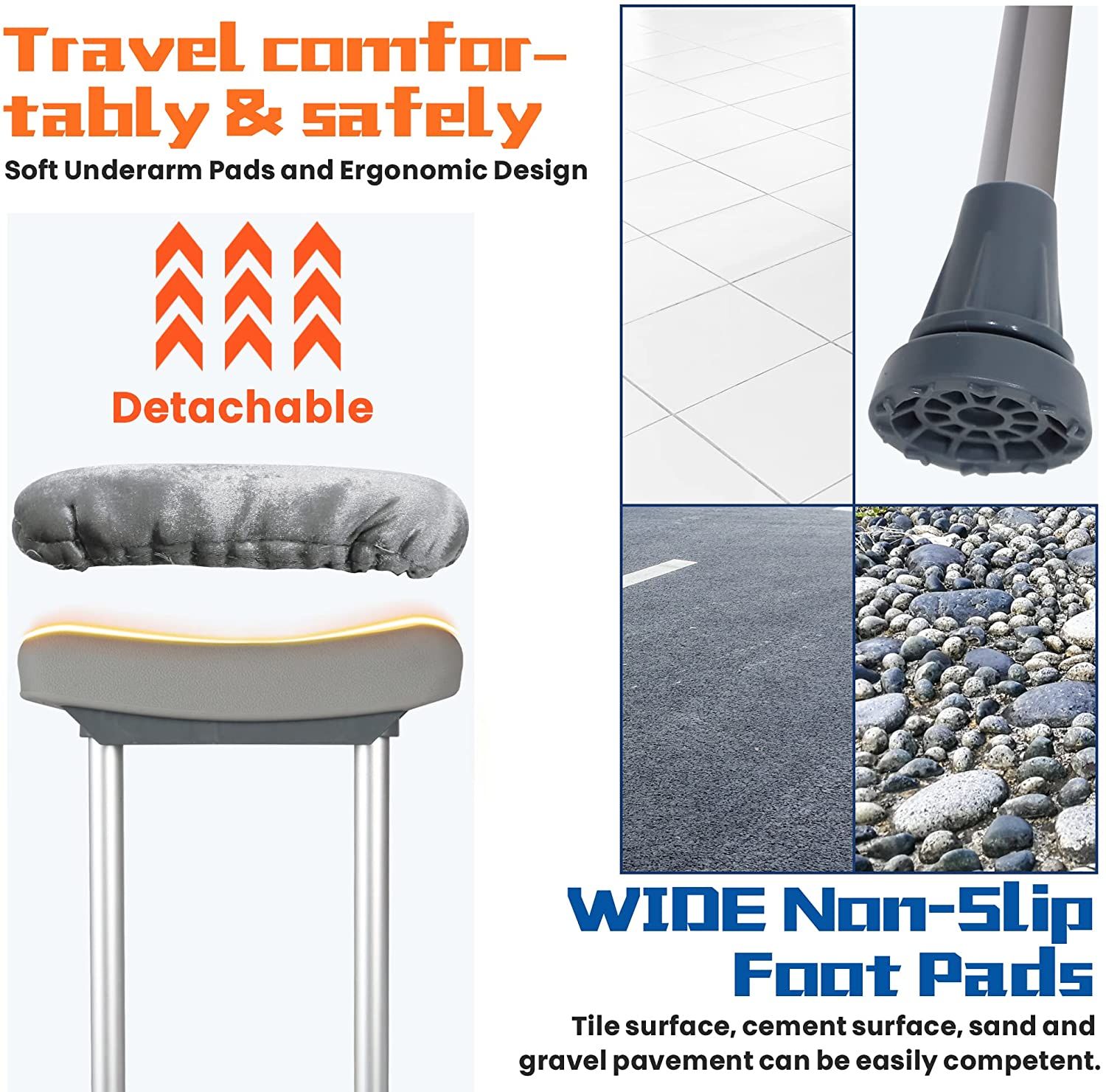 1.Aluminum Underarm Crutches are durable yet lightweight, with comfortable, adjustable padded hand grips and contoured underarm pads. Supporting weights of up to 300 pounds. Bolt fasteners allow easy adjustment of handle position. And the height scale provides walking assistance for users of different