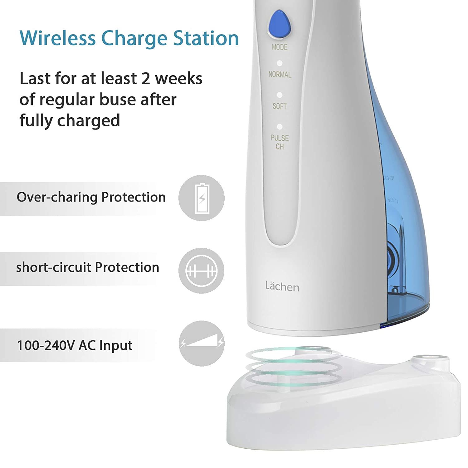 Wireless Charging Base & Long Battery Life - The cordless water flosser is equipped with a wireless charging base. Easily place it on the base to charge it and reduces the rate of product failure caused by water leakage from the plug inlet. The portable water floss charger can last 2 weeks per charge. 5 replacement Jet tips and best Choice for Home, Office, and TravelLatest Pulse Technique & Rotating Nozzle Design - Latest Water Flosser Pulse Technique, 50-90psi Pressure Range, 1800 Times/Min Pulse Rate, 360°rotating Long Nozzle,the cordless water floss can effectively deep clean 99.99% of the food residue in every corner, which is impossible to achieve with traditional brushing. Designed for periodontitis and braces.Three Mode & 2-Minute Timer - Normal, Gentle and Pulse modes to meet various oral care needs,choose the comfort mode that best suits your needs,recommended to use soft mode for the first time.Memory Function that helps to maintain the working mode that was used before. 2 minute automatic timer to avoid the water flossing device still working after cleaning is completed.Detachable Cleanable Water Tank - 220ML water tank for adequate and uninterrupted dental floss, no need to replenish water again and again. The upgraded detachable full-water tank allows you to thoroughly clean scales and plaque. The exclusive patented internal leak-proof drain design provides you with a safe, comfortable experience and extended product long lifespan.Double IPX7 Waterproof Protection - Both internal and external IPX7 waterproof design provides double protection. Intelligent design prevents leaks and allows the floss to be safely used in bathroom showers.